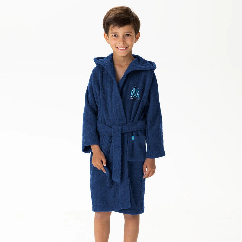 Peignoir à capuche pour enfant, logo OM brodé pour les plus grands fans du club de foot de Marseille. Confortable et respirant grâce au coton en micro-bouclette garantissant une absorption parfaite.
